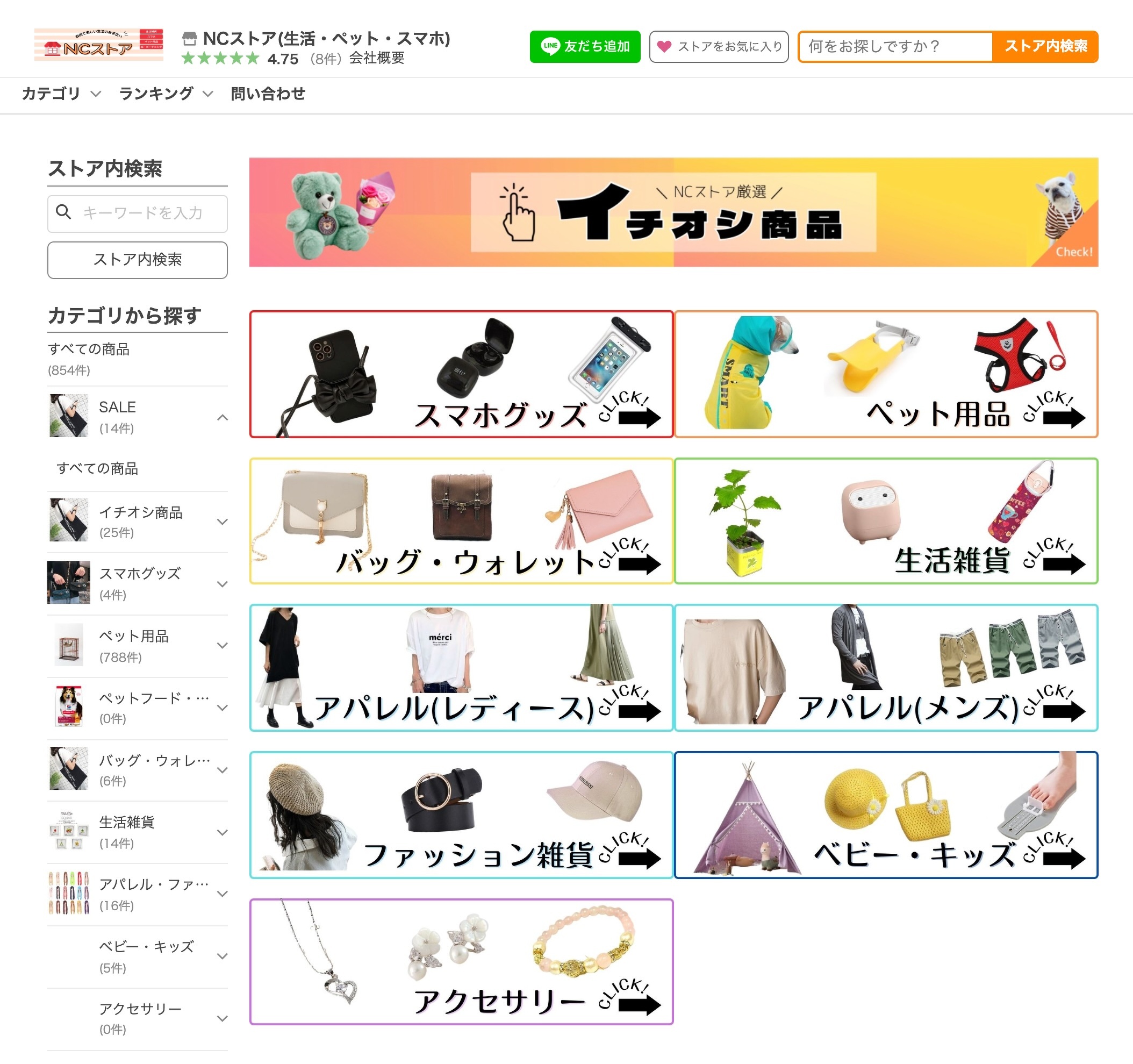 NCストア(生活・ペット・スマホ)|Yahoo!ショッピング 2024.01.25 2024.10.08 Yahoo!ショッピング ご契約プラン:開店代行サポートライトプラン https://store.shopping.yahoo.co.jp/nc-store/ ECサイト制作のお問い合わせkeyboard_arrow_right ECサイト制作実績一覧へ戻るkeyboard_arrow_left